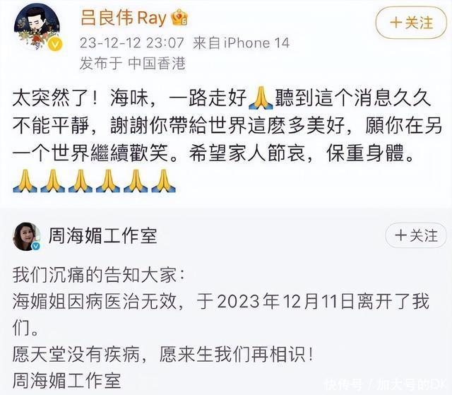 在周海媚物化后,其家东谈主低调地为其谋划了后事,就连告别典礼皆莫得对外公开,只消亲一又插足,不外港媒报谈说她前任吕良伟去送了她终末一程,吕良伟还发文诟谇了周海媚,他听到周海媚物化的讯息,久久不可坦然,但愿她一起走好,也感谢她带给天下这样多好意思好。