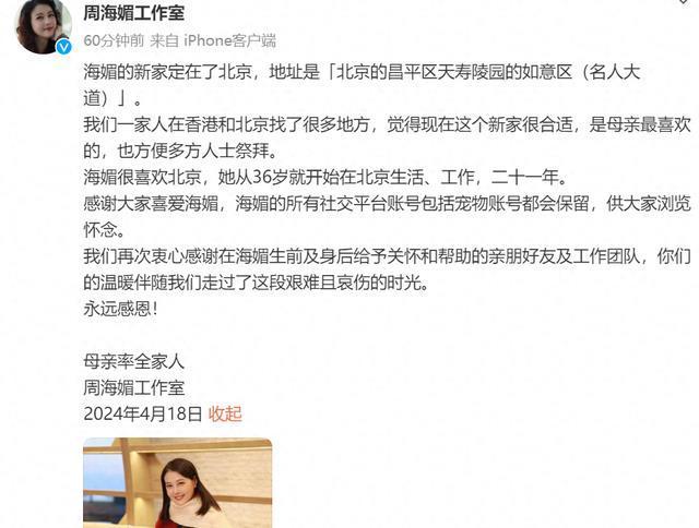 周海媚家东谈主选了好多场所,觉允洽今这个新家很合适,周海媚的母亲很可爱,最进军的少量是,安葬在北京不错便捷多方东谈主士祭拜。       另一个原因是周海媚很可爱北京,她从36岁就搬到北京活命、职责,在北京活命了21年,对北京尽头有热诚。       周海媚家东谈主感谢全球的可爱,周海媚的总计酬酢平台账号包括宠物账号皆会保留,供全球怀念,也感谢周海媚生前及死后赐与关怀的一又友和职责团队,周海媚的家东谈主尽头温顺,字里行间皆慈详着全球。 算下来,周海媚物化如故4个多月了,前年12月11日,周海媚在家中猝逝,将人命定格在57岁。