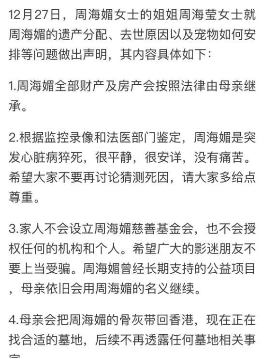 其姐姐对外发声,见知周海媚是突发腹黑病暴毙,很坦然、很安详,莫得灾祸,不外那时周海媚姐姐见知,其母亲决定将周海媚安葬在香港,后续不再表现任何坟场有关事宜。 好像是出于多方探究,周海媚母亲最终把男儿的“新家”定在北京天寿陵寝,而这里也安葬了好多名东谈主,其中包括相声专家侯耀文,“林妹妹”陈晓旭,还有国度一级演员       李媛媛。
